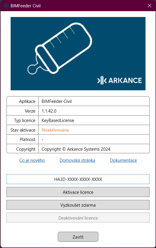 Aplikace Dopravák je licencována pomocí licencoru License Spring. K aktivaci aplikace je nutné mít platný licenční klíč. Při prvním spuštění aplikace, či při kliknutí na kterékoliv z tlačítek aplikace Dopravák v prostředí Civil 3D®, se zobrazí dialogové okno pro vložení klíč a aktivaci.