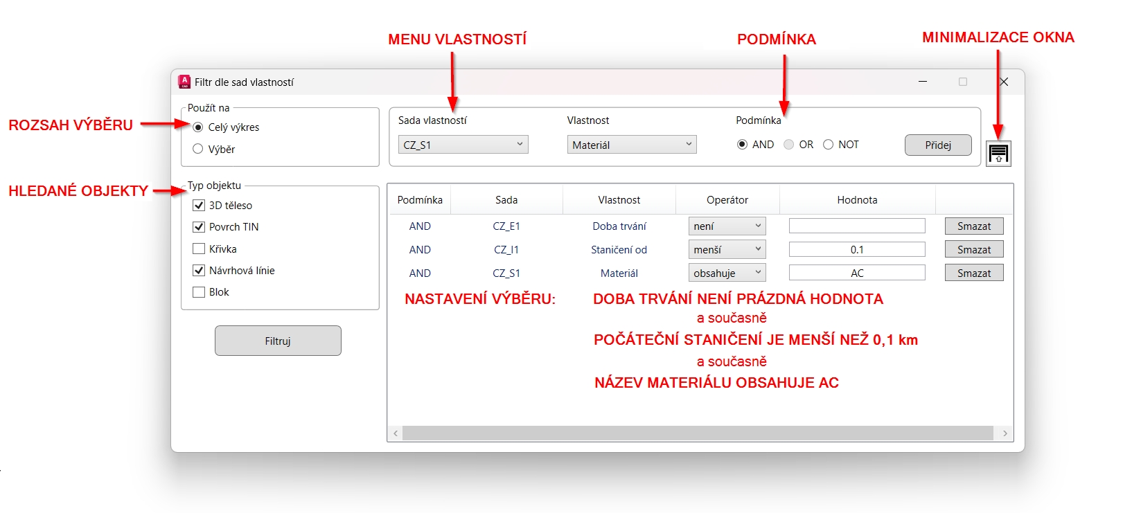 Nástroj uživateli umožňuje vybírat objekty, které splňují nastavené kritéria. Funkcionalita je podobná jako výchozího rychlého výběru, pracuje však s daty ze sad vlastností. Výběr je možný z celého výkresu nebo pouze z aktuálně vybraných objektů. Hledaný typ pak stanovuje, jaké objekty budou do výběru zahrnuty. Je možné filtrovat tyto typy objektů: 3D tělesa, povrchy TIN, křivky, návrhové linie a bloky. Uživatel dále volí z filtrovaných vlastností, při kombinaci vlastností je možné volit kombinaci podmínek: