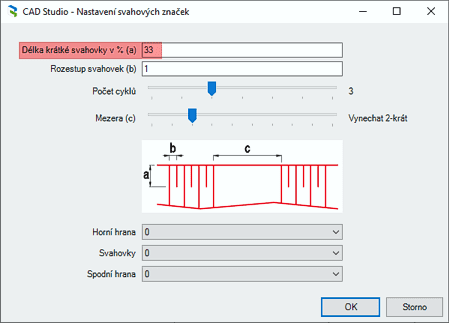 <img src="https://878884564-files.gitbook.io/~/files/v0/b/gitbook-x-prod.appspot.com/o/spaces%2FNqrZZh9xycBSlu5BVOCQ%2Fuploads%2FwAcrFejjPGg9Ndkj3ta7%2FSvahovkyTvor_32.png?alt=media&#x26;token=c360e805-c3e0-4447-a498-b4087ea81823" alt="" data-size="line"> Příkaz **csct\_SlopePatternCreate** zobrazí po vybrání dvou 2D křivek okno pro vytvoření svahových značek. Nástroj umožňuje nastavit parametry svahovek (délka krátké svahovky, rozestupy svahovek, mezery, počet cyklů a hladiny). Parametry jsou závislé na délce segmentů. Výsledkem je vygenerování svahových značek dynamicky napojených na definující 2D křivky. Při úpravě geometrie těchto křivek dojde automaticky k aktualizaci svahových značek. Parametry svahovek je možné upravovat i dodatečně pomocí příkazu <img src="https://878884564-files.gitbook.io/~/files/v0/b/gitbook-x-prod.appspot.com/o/spaces%2FNqrZZh9xycBSlu5BVOCQ%2Fuploads%2FDptvV1wYExz2xudfBUlF%2FSvahovkyUprav_32.png?alt=media&#x26;token=ca26bc87-d338-411b-a795-9c789bda1289" alt="" data-size="line"> **csct\_SlopePatternModify**. Je možné rozlišovat násep, zářez či příkop. Dle volby uživatele svahovky přizpůsobují svůj vzhled a polohu.