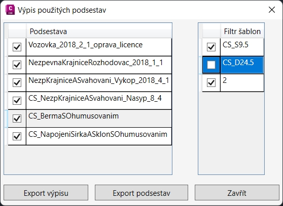 Příkaz csct_listusedsubassemblies otevře dialogové okno se seznamem podsestav z aktuálního výkresu. V seznamu lze filtrovat pomocí výběru šablon, ze kterých chceme podsestavy vypsat. Seznam obsahuje pouze vlastní uživatelské podsestavy, automaticky odfiltruje výchozí podsestavy Civilu (např. modré sirky).