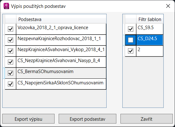 <img src="https://878884564-files.gitbook.io/~/files/v0/b/gitbook-x-prod.appspot.com/o/spaces%2FNqrZZh9xycBSlu5BVOCQ%2Fuploads%2FAxSB0ke3Y19XjnwmAMaC%2FVypisPodsestav_32.png?alt=media&#x26;token=25c153f0-edcf-4679-bcd9-f8037d2311e5" alt="" data-size="line"> Příkaz **csct\_listusedsubassemblies** otevře dialogové okno se seznamem podsestav z aktuálního výkresu. V seznamu lze filtrovat pomocí výběru šablon, ze kterých chceme podsestavy vypsat. Seznam obsahuje pouze vlastní uživatelské podsestavy, automaticky odfiltruje výchozí podsestavy Civilu (např. modré sirky).