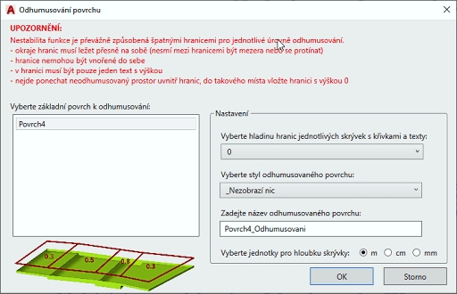 Nástroj pro generování odhumusovaného povrchu na základě křivkami zadaných polygonů a hloubek jednotlivých skrývek ornice, které vycházejí z pedologického průzkumu. Uživatel jednoduše vybere hladinu s hraničními křivkami a texty, výsledný styl a funkce následně vygeneruje odhumusovaný povrch o různých hloubkách skrývky. Lze vybrat také různé jednotky pro hloubku odhumusování.