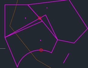 Během běhu funkce se kontroluje správnost hranic regionů odhumusování a vizuálně jsou zobrazeny případné chyby – např. označení křížení, oblouků: