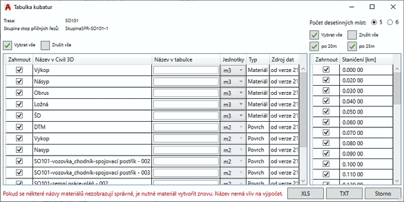 Generování XLS tabulky kubatur a délek povrchů