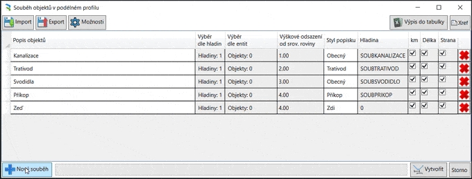 Nástroj do zvoleného podélného profilu zakreslí souběh trasy a vybraných objektů, typicky příkopů, trativodů, protihlukových clon, svodidel nebo zdí a dalších. Podle uživatelského nastavení je pak souběh doplněn o popis počátečního a koncového staničení souběhu, skutečnou délku objektu a stranu, na které se objekt nachází. Objekty lze načíst výběrem nebo dle hladin. Doplněna i možnost vybírat automatickou návrhovou linii z koridoru. Hladiny je možné použít také z referenčních výkresů. Nadefinované souběhy lze vyexportovat do tabulky. Příkaz CSCT_Soubeh spouští dialog.