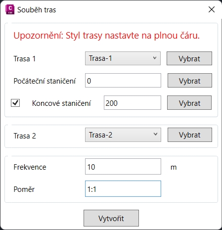 Příkaz csct_soubeh_tras vytvoří 2D křivku mezi dvěma trasami tak, aby kolmá vzdálenost libovolného bodu křivky k oběma trasám byla shodná. Rozsah souběhu zadá uživatel pomocí staničení první vybrané trasy. Může zvolit pouze počáteční místo souběhu nebo přidat i koncové staničení, kde souběh tras ukončí. Přesnost výpočtu se řídí nastavením frekvence, která určuje vzdálenost bodů vytvářené 2D křivky. Výchozí hodnota poměru vzdáleností 1:1, tedy shodná vzdálenost křivky od obou tras, lze upravit dle potřeby.