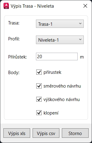 Vytvoří report bodů geometrie směrového a výškového návrhu, klopení a v pravidelném přírůstku.