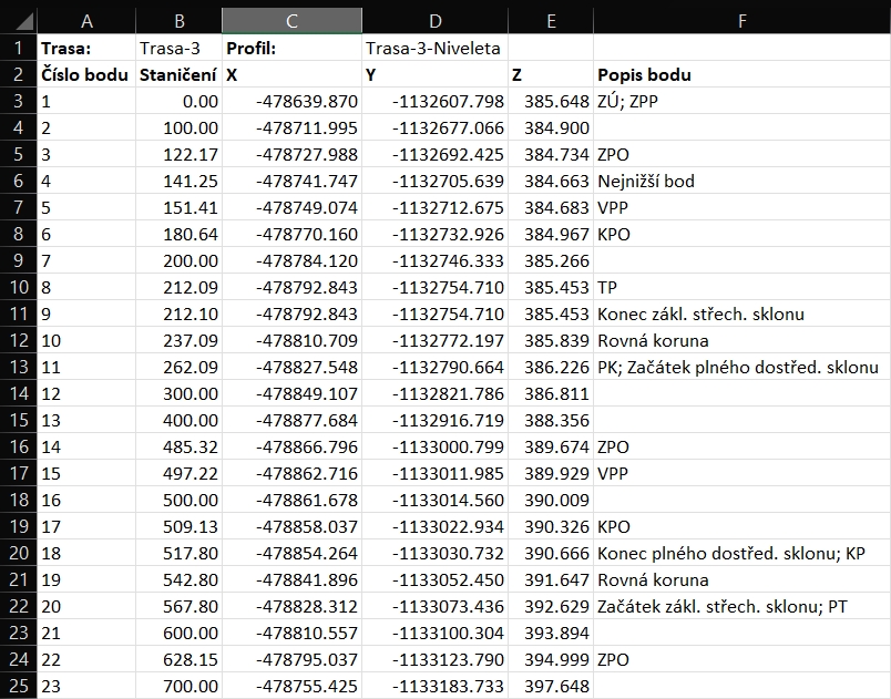 Příkaz csct_niveletasummary vygeneruje výpis s informacemi o bodech trasy a nivelety. Uživatel může volit mezi 4 typy bodů: body v pravidelném přírůstku staničení, geometrické body směrového návrhu, geometrické body výškového návrhu a body kritických míst klopení. Výsledný výpis lze uložit do formátu XLS pro tvorbu například technické zprávy. Nebo lze zvolit formát CSV, který je určen pro opětovný import COGO bodů do vytyčovacího výkresu.